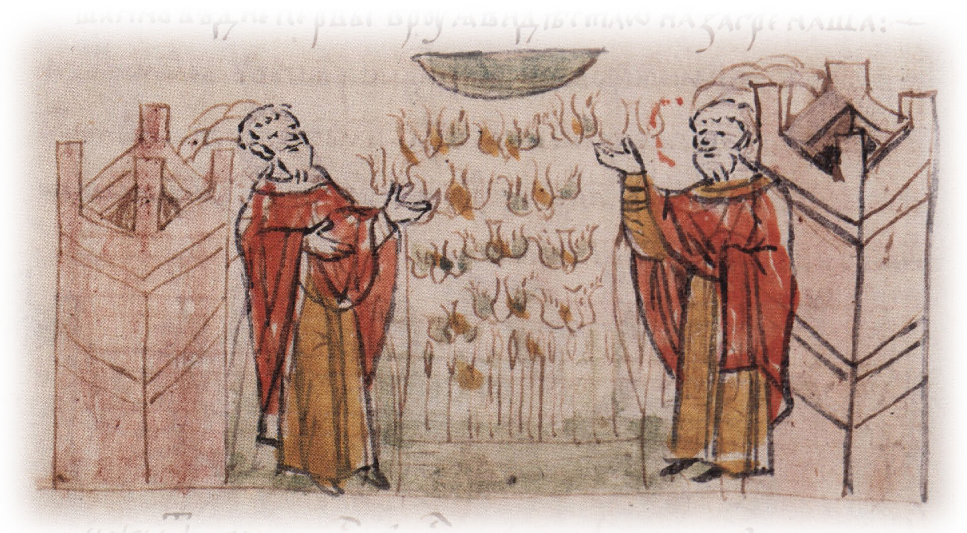 Рисунок "мастера Б" — перо. Правлен (фигуры, лица, архитектура справа, "небо") "мастера В" — кисть.