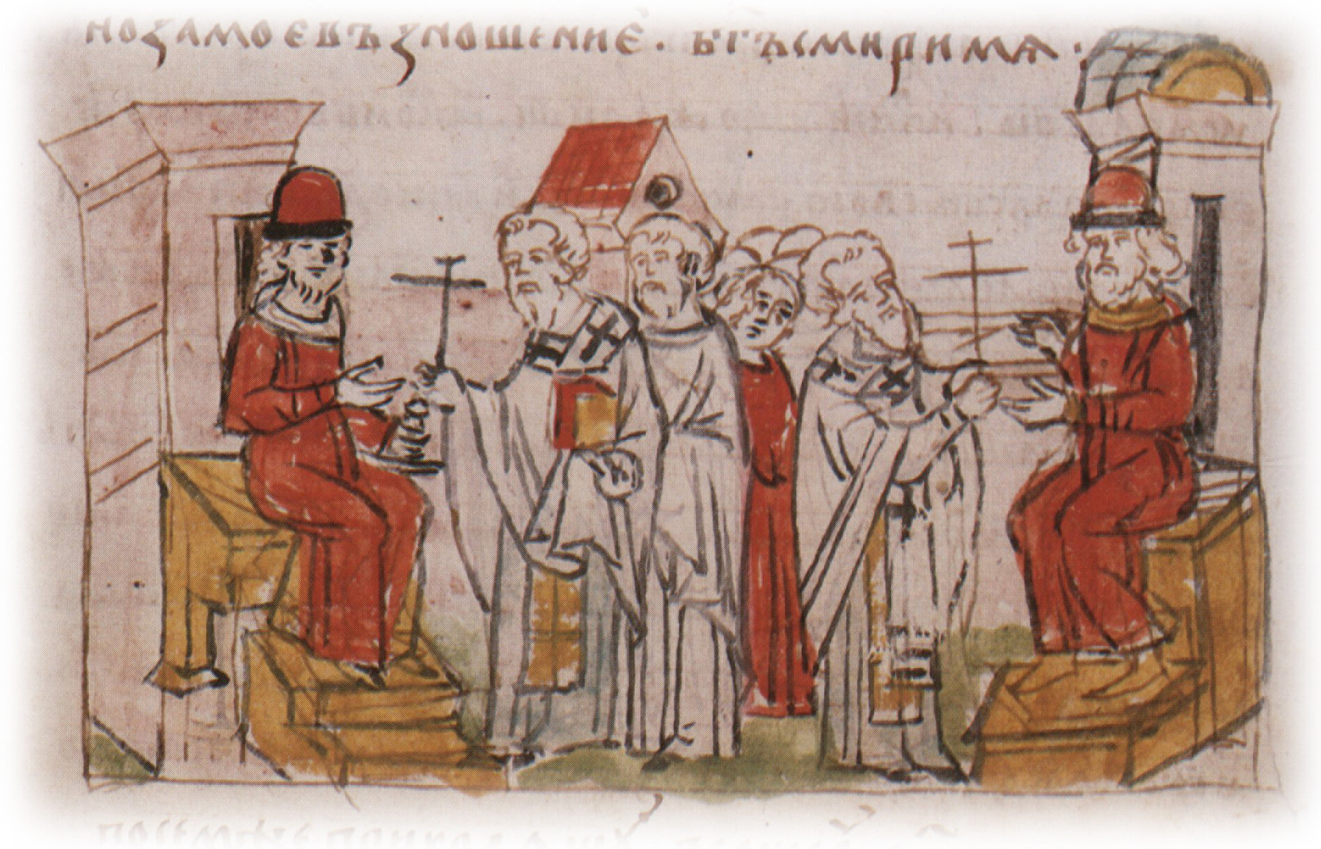Целование креста Владимиром Всеволодовичем Мономахом (Переяславским) и Святополком Изяславичем Киевским в знак примирения.