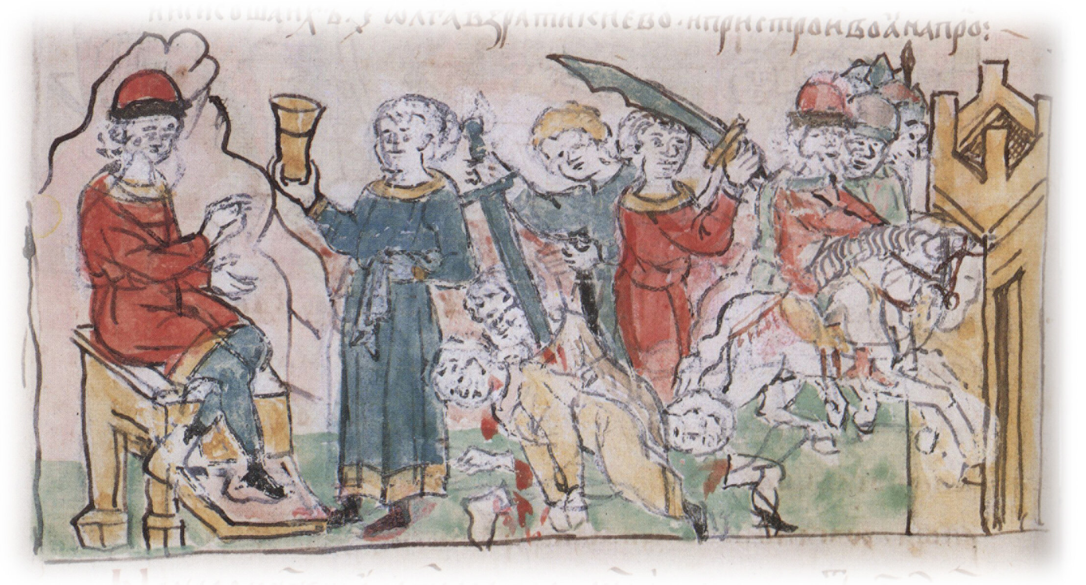 "По сем седоша пити деревляне, и повеле Олга отроком своим служити пред ними... И яко упишася деревляне, повеле отроком своим пити на ня, а сама отъиде кроме, и повеле дружине своей сечи деревляны, и иссекоша их 5000".