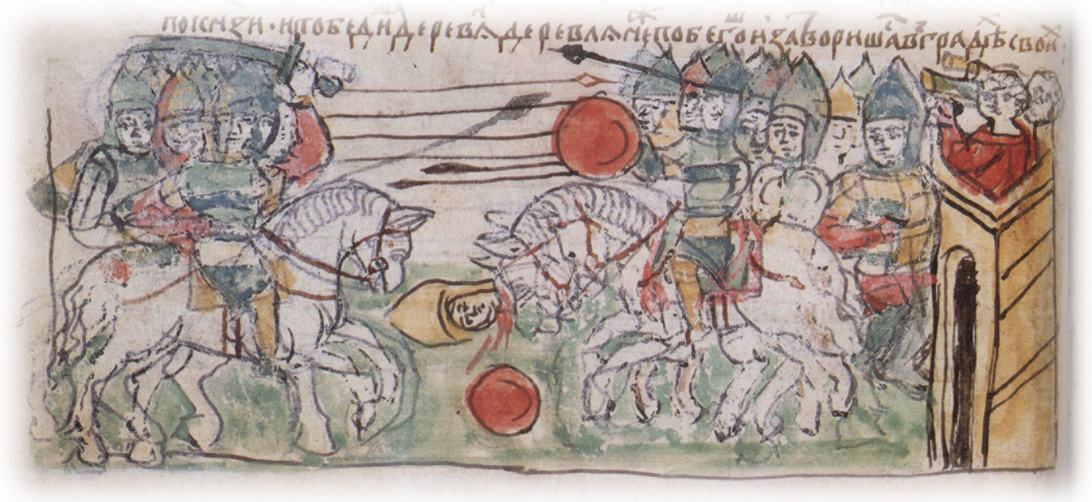"В лето 6454. Олга же со сыном своим Святославом собра вои много и храбры и иде на Деревяньскую землю. И изидоша деревляне противу... И победиша деревлян. Деревляне же побегоша и затворишася в градех своих".