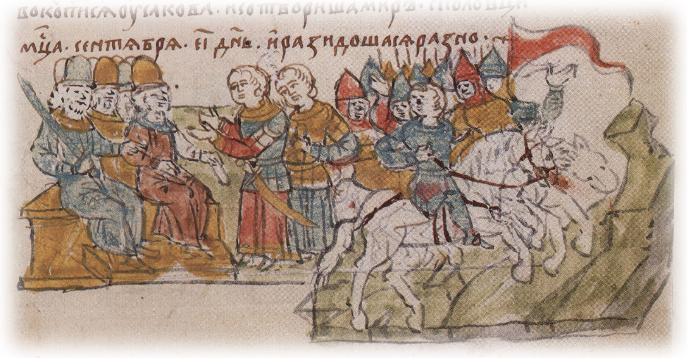 "В том же лете совокупишася братия вся Святополк, Володимир, Давыд, Олег, Ярослав, брат ею, на Золотчи. И прислаша половци послы... и сотвориша мир с половци месяца сентября 15 день, и разидошася розно".