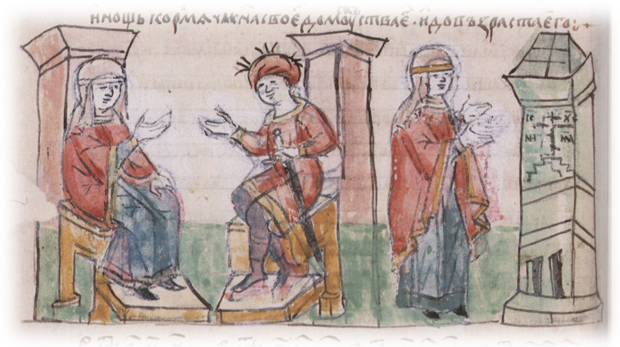 "Живяше же Олга сыном Святославом, и учашеть и мати креститися, и небрежаше того, ни во уши приимати... И се рекши, моляшеся за сына и за люди по вся дни и нощь, коръмячи сына своего до мужьства его и до възраста его".