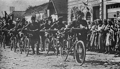 Местное венгерское население радостно встречает венгерские войска, вступающие в Северную Трансильванию. Сентябрь 1940 г.
