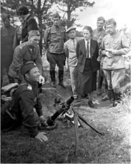 Полковник С. Берлинг (нагибается, второй слева) принимает в военном лагере под Рязанью делегацию Союза Польских Патриотов во главе с Вандой Василевской. Июль 1943 г.