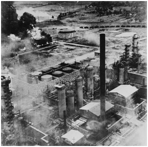 Пожар на нефтехранилищах в Плоеште, вызванный бомбардировкой авиацией США.