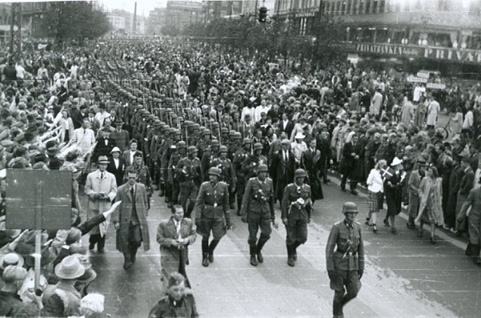 Солдаты датского Свободного корпуса СС маршируют по улицам Копенгагена перед отправкой на Восточный фронт.