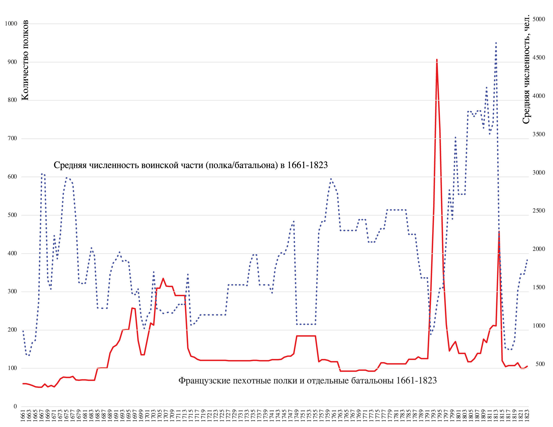 Количество полков и средняя численность в 1661–1823 гг.