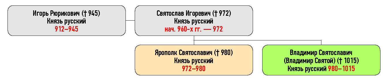 Игорь Рюрикович († 945) Князь русский, Святослав Игоревич († 972) Князь русский, Ярополк Святославич († 980) Князь русский, Владимир Святославич (Владимир Святой) († 1015)