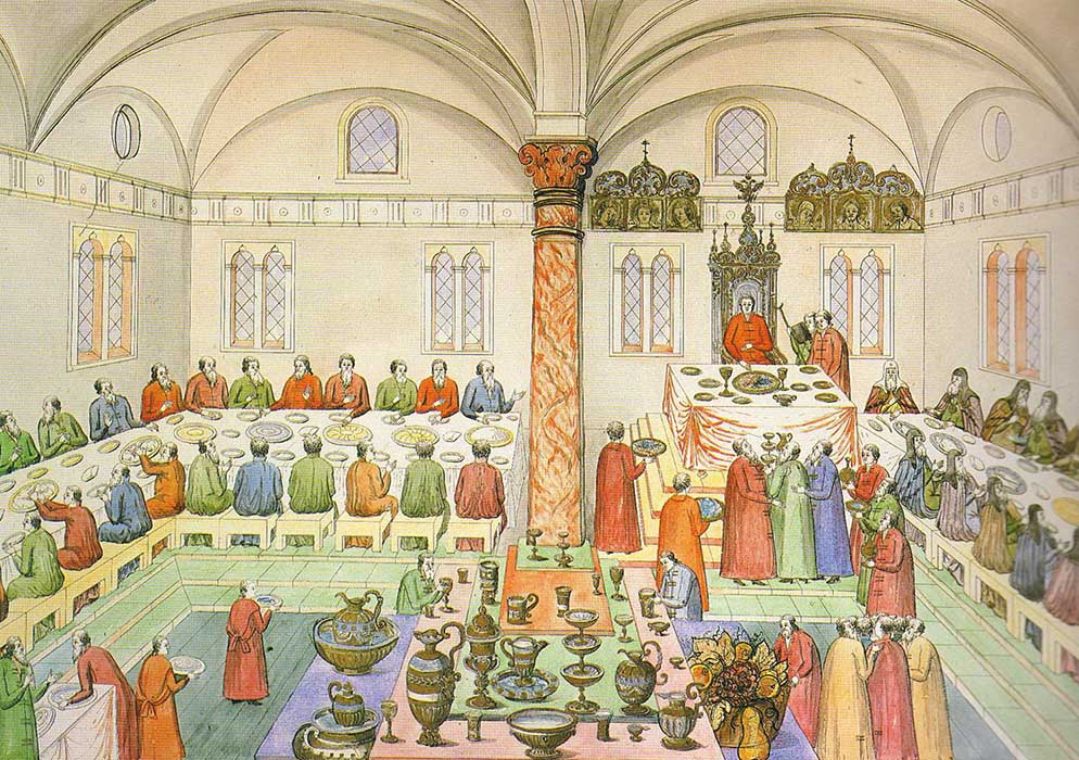 Миниатюры из «Книги об избрании и венчании на царство царя и великого князя Михаила Фёдоровича». 1672-1673. 11, 12, 13 июля 1613 года. Пир в Грановитой палате Московского Кремля по случаю венчания на царство Михаила Федоровича