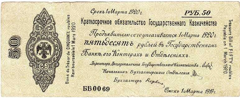 Краткосрочное обязательство Государственного Казначейства Российского правительства адмирала А.В. Колчака 50 руб. Срок 1 марта 1920 г. Аверс