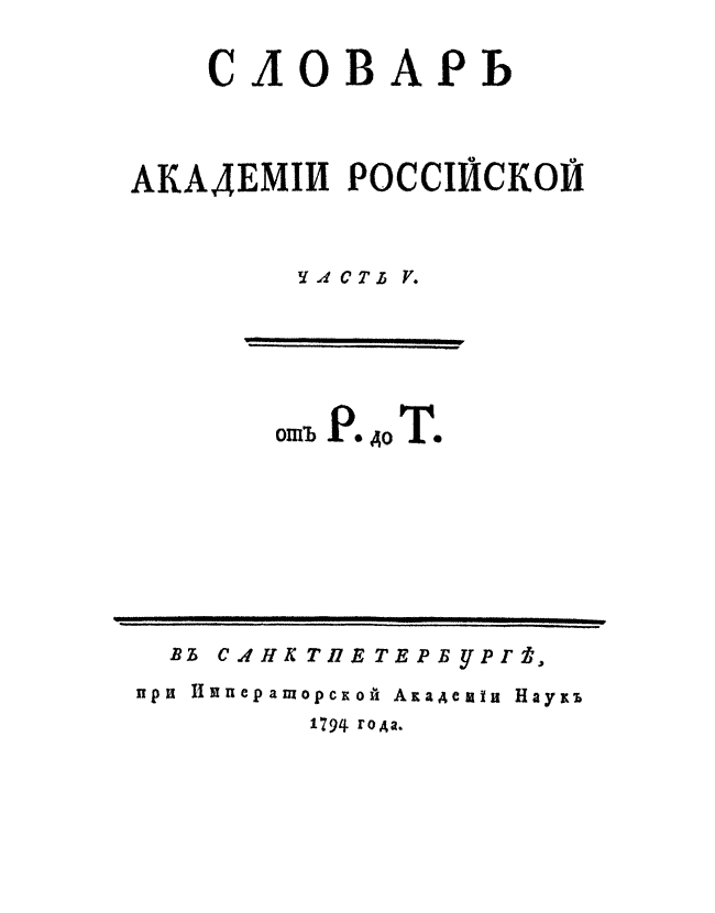 Знаменитый словарь Российской Академии, первый толковый словарь русского языка, содержащий 43 357 слов в 6 частях. Работа над словарём началась в 1783 году, и заняла 11 лет.