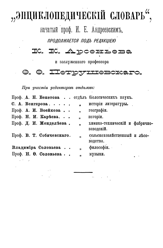 После кончины Андреевского новая редакция во главе с К. К. Арсеньевым и Ф. Ф. Петрушевским значительно увеличила число оригинальных статей и привлекла к сотрудничеству широкий круг общественно-политических деятелей либерального толка (от П. Н. Милюкова, В. И. Герье, Н. И. Кареева до легальных марксистов П. Б. Струве и М. И. Туган-Барановского, раздел философии вел крупнейший русский религиозный философ Вл. С. Соловьев), а также таких крупнейших ученых как Д. И. Менделеев, А. И. Бекетов, А. И. Воейков, Д. И. Анучин, Ю. М. Шокальский, Н. М. Книпович, А. О. Ковалевский, А. И. Советов, В. С. Соловьев и др.