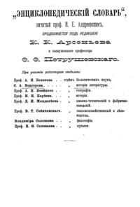 Самая крупная дореволюционная русская универсальная энциклопедия, выпущенная акционерным издательским обществом «Ф. А. Брокгауз — И. А. Ефрон». Состоит из 86 томов (82 основных и 4 дополнительных), выходивших в течение 1890-1907 годов. Первые 8 томов (до буквы «В») вышли под общей редакцией профессора И. Е. Андреевского и в основном содержали переводы на русский язык статей знаменитой немецкой энциклопедии Брокгауза «Konversations Lexikon».