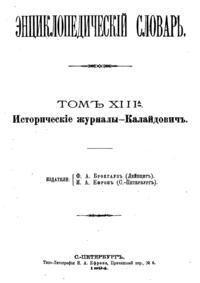 Самая крупная дореволюционная русская универсальная энциклопедия, выпущенная акционерным издательским обществом «Ф. А. Брокгауз — И. А. Ефрон». Состоит из 86 томов (82 основных и 4 дополнительных), выходивших в течение 1890-1907 годов. Первые 8 томов (до буквы «В») вышли под общей редакцией профессора И. Е. Андреевского и в основном содержали переводы на русский язык статей знаменитой немецкой энциклопедии Брокгауза «Konversations Lexikon».