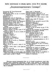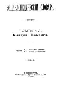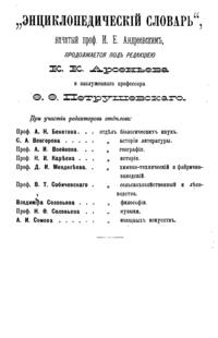 Самая крупная дореволюционная русская универсальная энциклопедия, выпущенная акционерным издательским обществом «Ф. А. Брокгауз — И. А. Ефрон». Состоит из 86 томов (82 основных и 4 дополнительных), выходивших в течение 1890-1907 годов. Первые 8 томов (до буквы «В») вышли под общей редакцией профессора И. Е. Андреевского и в основном содержали переводы на русский язык статей знаменитой немецкой энциклопедии Брокгауза «Konversations Lexikon».