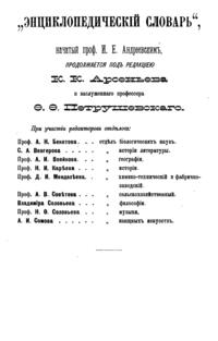 Самая крупная дореволюционная русская универсальная энциклопедия, выпущенная акционерным издательским обществом «Ф. А. Брокгауз — И. А. Ефрон». Состоит из 86 томов (82 основных и 4 дополнительных), выходивших в течение 1890-1907 годов. Первые 8 томов (до буквы «В») вышли под общей редакцией профессора И. Е. Андреевского и в основном содержали переводы на русский язык статей знаменитой немецкой энциклопедии Брокгауза «Konversations Lexikon».