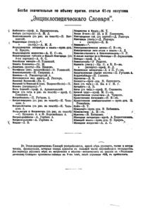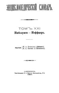 Самая крупная дореволюционная русская универсальная энциклопедия, выпущенная акционерным издательским обществом «Ф. А. Брокгауз — И. А. Ефрон». Состоит из 86 томов (82 основных и 4 дополнительных), выходивших в течение 1890-1907 годов. Первые 8 томов (до буквы «В») вышли под общей редакцией профессора И. Е. Андреевского и в основном содержали переводы на русский язык статей знаменитой немецкой энциклопедии Брокгауза «Konversations Lexikon».