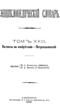 Самая крупная дореволюционная русская универсальная энциклопедия, выпущенная акционерным издательским обществом «Ф. А. Брокгауз — И. А. Ефрон». Состоит из 86 томов (82 основных и 4 дополнительных), выходивших в течение 1890-1907 годов. Первые 8 томов (до буквы «В») вышли под общей редакцией профессора И. Е. Андреевского и в основном содержали переводы на русский язык статей знаменитой немецкой энциклопедии Брокгауза «Konversations Lexikon».