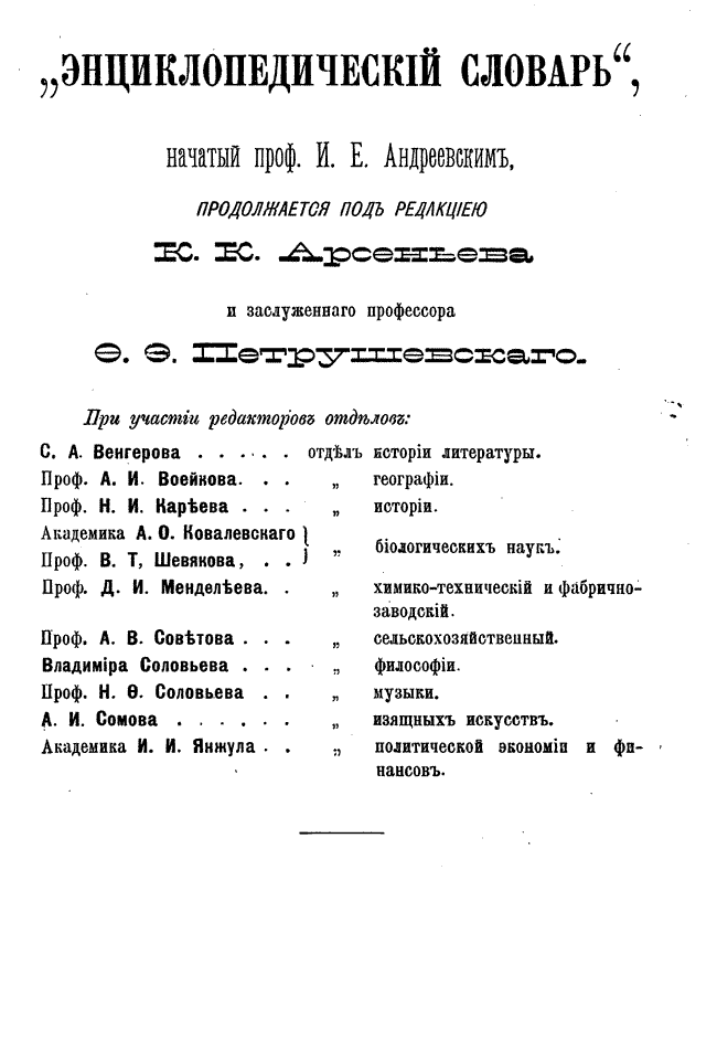 После кончины Андреевского новая редакция во главе с К. К. Арсеньевым и Ф. Ф. Петрушевским значительно увеличила число оригинальных статей и привлекла к сотрудничеству широкий круг общественно-политических деятелей либерального толка (от П. Н. Милюкова, В. И. Герье, Н. И. Кареева до легальных марксистов П. Б. Струве и М. И. Туган-Барановского, раздел философии вел крупнейший русский религиозный философ Вл. С. Соловьев), а также таких крупнейших ученых как Д. И. Менделеев, А. И. Бекетов, А. И. Воейков, Д. И. Анучин, Ю. М. Шокальский, Н. М. Книпович, А. О. Ковалевский, А. И. Советов, В. С. Соловьев и др.