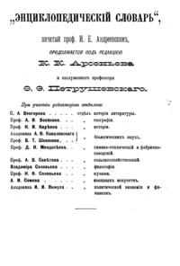 Самая крупная дореволюционная русская универсальная энциклопедия, выпущенная акционерным издательским обществом «Ф. А. Брокгауз — И. А. Ефрон». Состоит из 86 томов (82 основных и 4 дополнительных), выходивших в течение 1890-1907 годов. Первые 8 томов (до буквы «В») вышли под общей редакцией профессора И. Е. Андреевского и в основном содержали переводы на русский язык статей знаменитой немецкой энциклопедии Брокгауза «Konversations Lexikon».