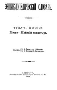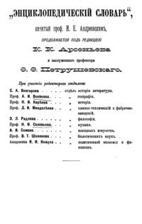 Самая крупная дореволюционная русская универсальная энциклопедия, выпущенная акционерным издательским обществом «Ф. А. Брокгауз — И. А. Ефрон». Состоит из 86 томов (82 основных и 4 дополнительных), выходивших в течение 1890-1907 годов. Первые 8 томов (до буквы «В») вышли под общей редакцией профессора И. Е. Андреевского и в основном содержали переводы на русский язык статей знаменитой немецкой энциклопедии Брокгауза «Konversations Lexikon».