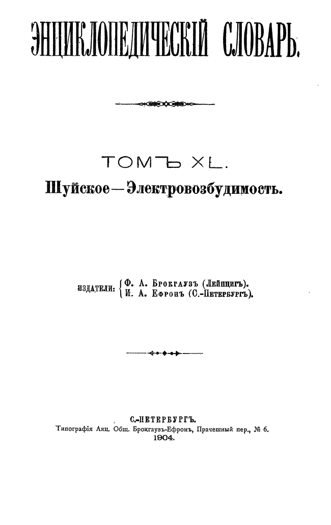 Энциклопедический словарь Брокгауза и Ефрона: Том XL (79). Шуйское — Электровозбудимость