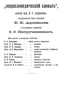 Самая крупная дореволюционная русская универсальная энциклопедия, выпущенная акционерным издательским обществом «Ф. А. Брокгауз — И. А. Ефрон». Состоит из 86 томов (82 основных и 4 дополнительных), выходивших в течение 1890-1907 годов. Первые 8 томов (до буквы «В») вышли под общей редакцией профессора И. Е. Андреевского и в основном содержали переводы на русский язык статей знаменитой немецкой энциклопедии Брокгауза «Konversations Lexikon».