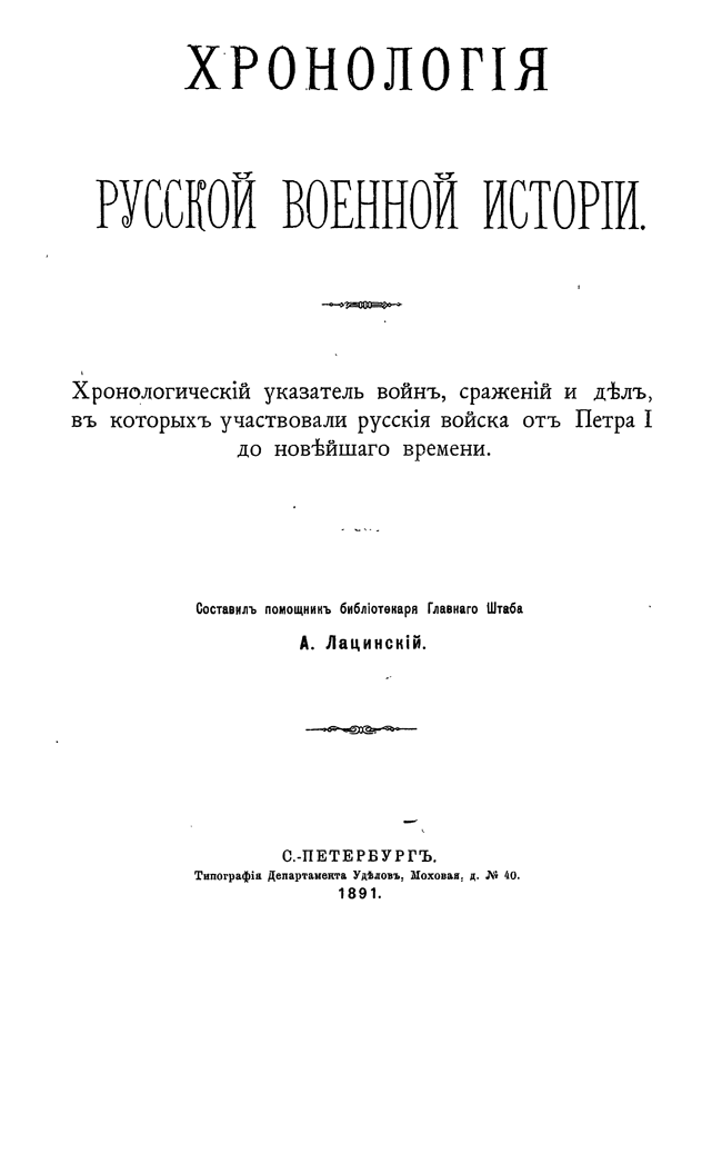 Помощник библиотекаря Главного штаба, А. С. Лацинский, опираясь на уже существующие капитальные труды по истории, составил первый хронологический свод русской военной истории. Работа охватывает период от правления Петра I до новейшего времени. Начиная с царствования Петра Великого, положившего начало регулярному устройству русских войск, Россия в течение двух столетий вела многие войны как в Европе, так и в Азии. На континенте Европы нет страны, за исключением Испании и Португалии, куда не проникали бы русские войска или в качестве неприятеля, или в качестве союзников: Швеция, Дания, Польша, Германия, Франция, Италия, Швейцария, Голландия, Австрия, Венгрия, Турция, Сербия, Болгария, Румыния — были театрами войн. В странах Азии (Кавказ, Персия, Туркестан) Россия также вела многие войны, ознаменовавшиеся победами ее оружия.