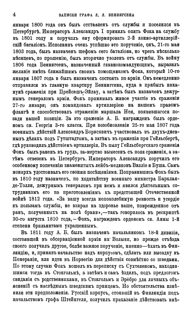 показал себя с лучшей стороны, дав Наполеону кровавый бой под Прейсиш-Эйлау. Записки генерала — не попытка оправдаться за проигранную кампанию, а обстоятельный доклад о прошедших событиях с позиции одного из самых осведомленных в этом вопросе людей.