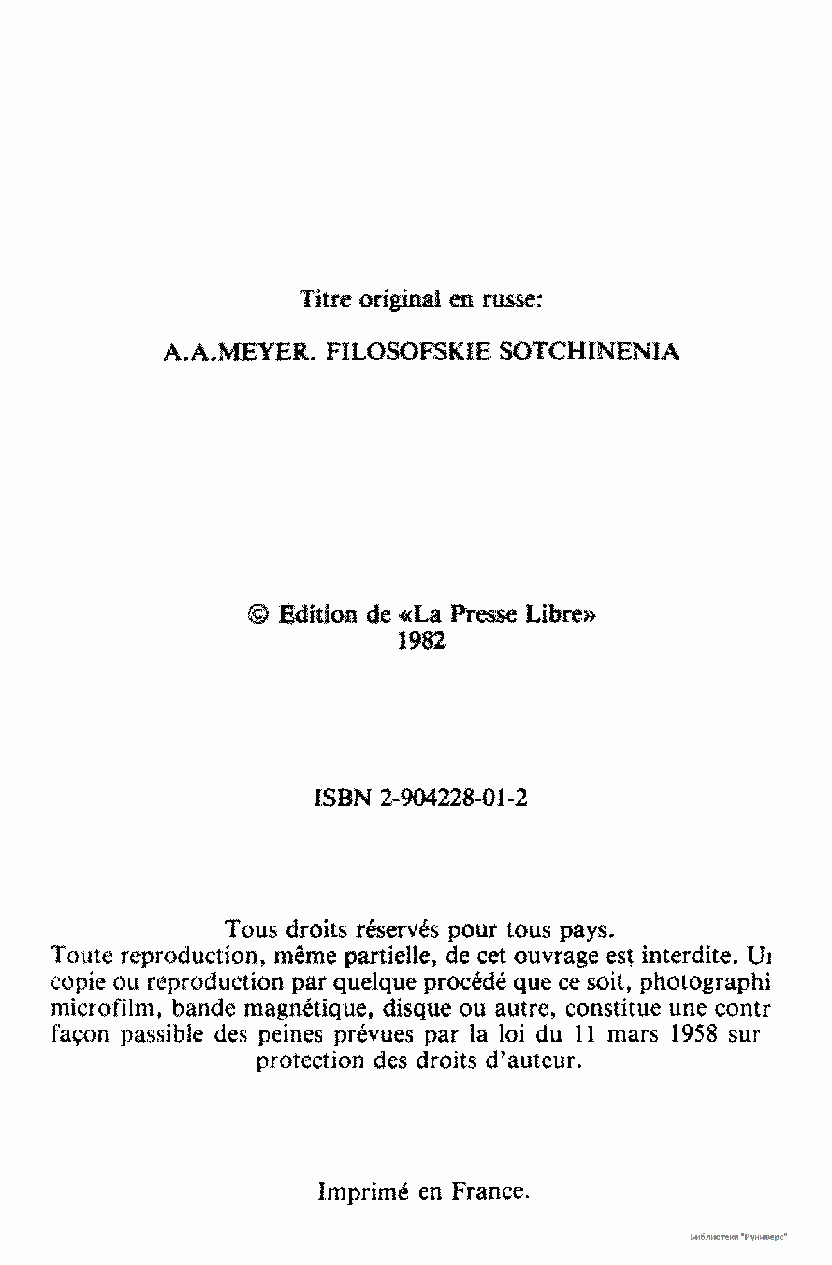 (1906 - 1999) в своих "Воспоминаниях" отметил, что "Философские сочинения" А.А.Мейера, вышедшие в Париже в 1982 г., "производят впечатление написанных как бы со знанием работ Леви-Стросса, К. Юнга, Б. Малиновского и
