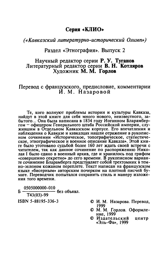 Эта книга была написана в 1834 году Иоганном Бларамбергом — офицером Генерального штаба Российской империи, служившим в Отдельном Кавказском корпусе. Еще в начале 1828 года Николай I отдал приказ о необходимости составления свода материалов о горских и кочевых народах Кавказа, что впоследствии было поручено осуществить Бларамбергу.