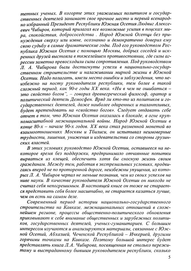 Автором настоящей книги является очевидец и активный участник событий, который в течение восьми труднейших лет (1993-2001) руководил Республикой Южная Осетия сперва в качестве Председателя Верховного Совета, а затем Президента республики. Анализ общественно-политической обстановки, межнациональных отношений в Южной Осетии и Грузии чередуются с интересными экскурсами в историю, философию и юриспруденцию. Они, в свою очередь, сменяются авторскими размышлениями о происходивших событиях в Южной Осетии, Грузии, Российской Федерации, их причинах и следствиях, перспективах решения сложившихся проблем, накопившихся за многие годы.