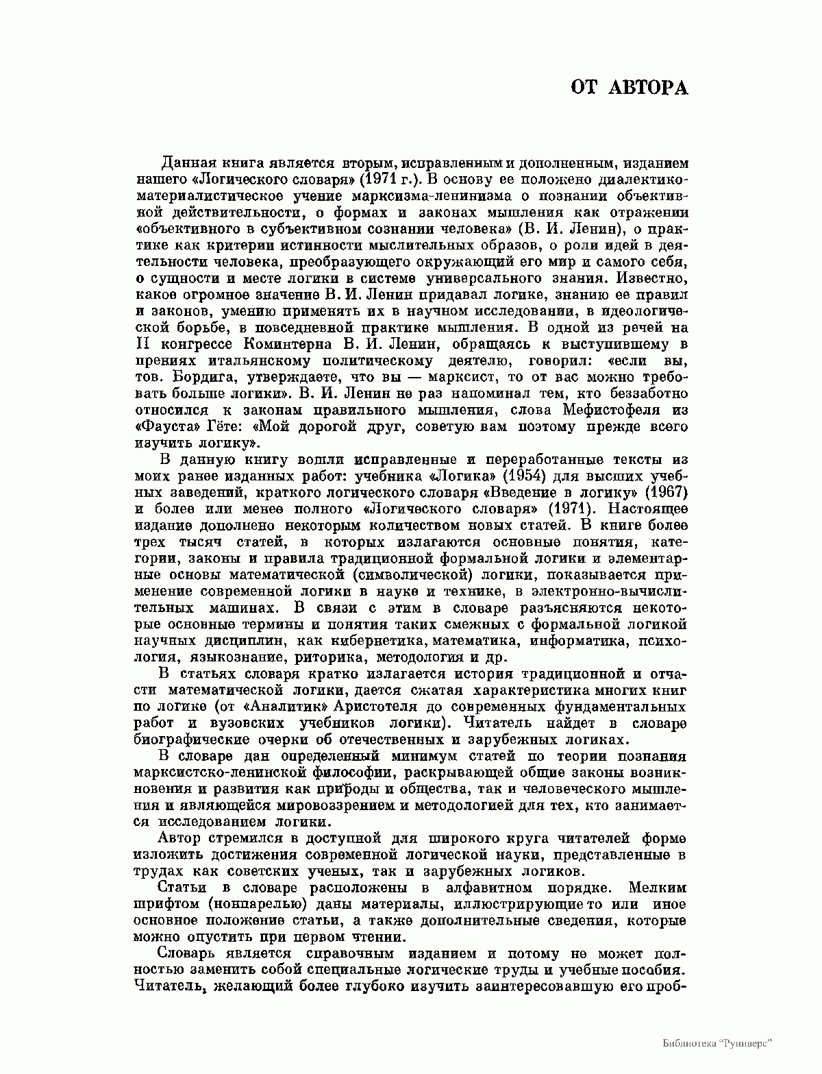 Словарь содержит более трех тысяч статей, в которых на уровне достижений современной науки излагаются основные понятия и категории классической традиционной и математической (символической) логик, рассказывается о применении их в повседневной практике мышления, в процессе самообразования и учебных занятий, в спорах и дискуссиях, в научно-исследовательской деятельности, в электронно-вычислительной технике.