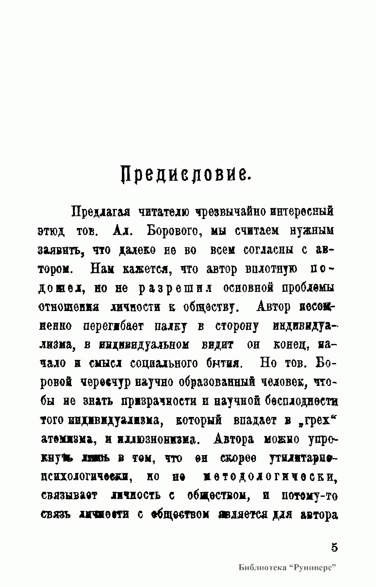 Из Предисловия издательства "Голос Труда": "Нам кажется, что автор вплотную подошел, но не разрешил основной проблемы отношения личности к обществу. Автор несомненно перегибает палку в сторону индивидуализма, в индивидуальном видит он конец, начало и смысл социального бытия... Но тов. Боровой чересчур научно образованный человек, чтобы не знать призрачности и научной бесплодности того индивидуализма, который впадает в „грех" атомизма, и иллюзионизма".