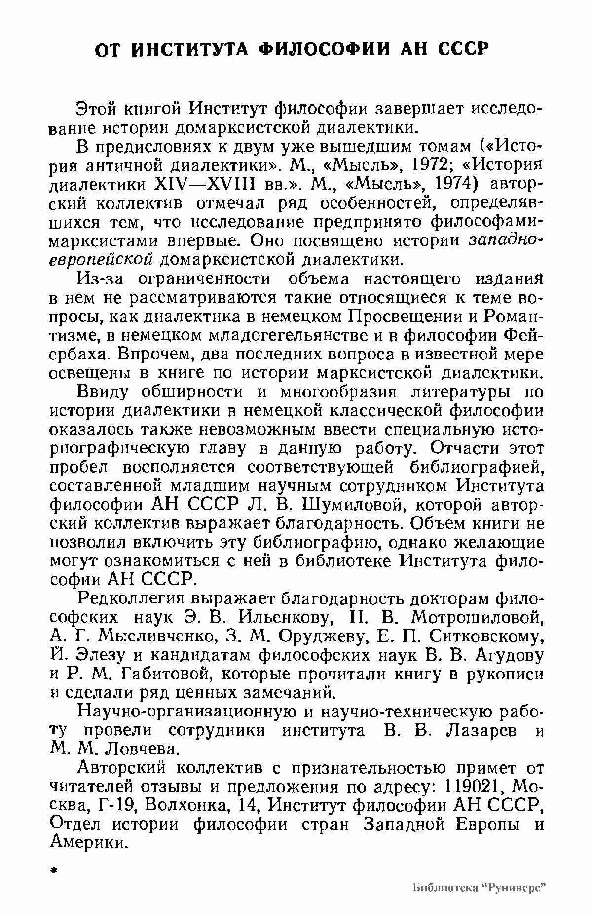 В книге впервые в советской научной литературе представлено целостное рассмотрение диалектического метода классиков немецкой идеалистической философии. Продолжая марксистские традиции исследования диалектики Гегеля, эта коллективная монография освещает также недостаточно изученные с точки зрения истории диалектики учения Канта, Фихте и Шеллинга. Она дополняет опубликованные ранее работы по истории домарксистской диалектики.