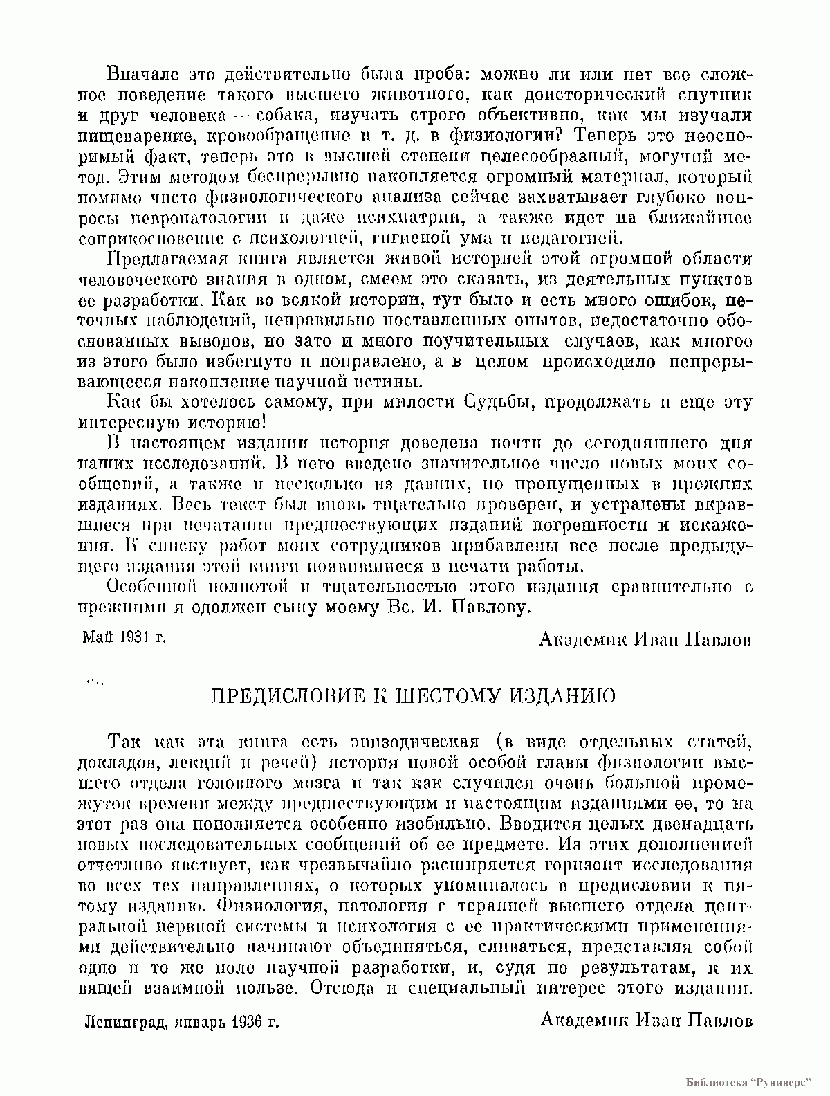 Книга Ивана Петровича Павлова с символическим названием «Двадцатилетний опыт объективного изучения высшей нервной деятельности (поведения) животных» в настоящем наиболее полном ее издании является своеобразной летописью всей, полной драматическими событиями истории зарождения и развития эпохального значения его исследований по физиологии большого мозга, всех этапов формирования, развития и совершенствования его великого материалистического учения о высшей нервной деятельности, отображает всю панораму его подвижнического труда и страстной борьбы за любимое научное детище. Вот почему нам представляется, что в известном отношении главным трудом Павлова, дающим более полное представление об его учении о высшей нервной деятельности, следует считать именно эту книгу.Первое издание этого капитального труда академика И. П. Павлова было осуществлено пятьдесят лет тому назад. Настоящее 10-е издание этой книги на русском языке, в основу которого положено шестое издание, подготовленное к печати самим автором, является по существу юбилейным, к тому же вдвойне юбилейным. В 1973 г. исполнилось не только пятьдесят лет со времени первого издания «Двадцатилетнего опыта» Павлова, но и семьдесят лет со времени его исторической речи на Международном медицинском конгрессе в Мадриде под названием «Экспериментальная психология и психопатология па животных», речи яркой, смелой, программной, возвещающей научный мир об официальном рождении великого учения о высшей нервной деятельности — одного из величайших достижений естествознания столетия.Книга рассчитана на физиологов, психологов, медиков, философов и широкий круг биологов.