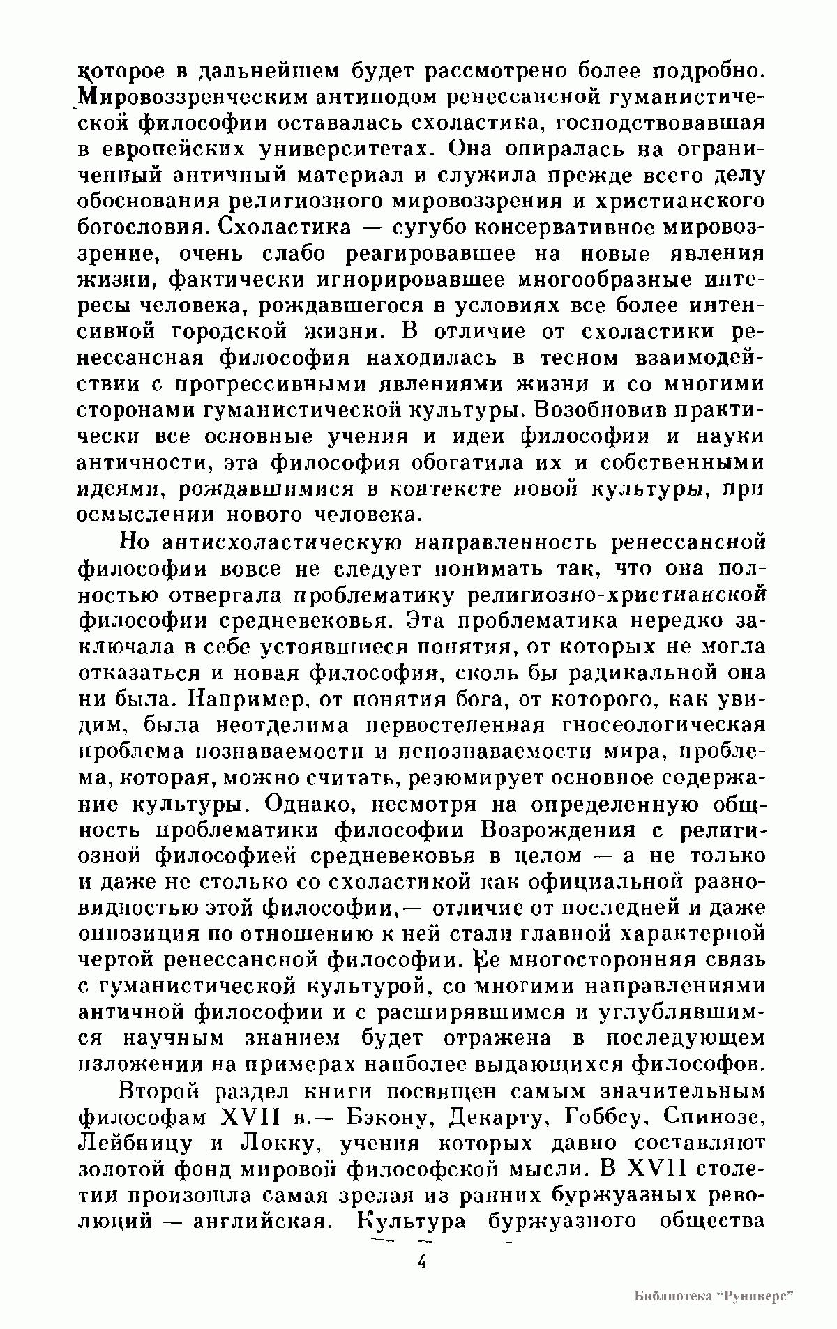 Автор книги анализирует все основные направления европейской философии и учения ее главных представителей с начала эпохи Возрождения до всхода эпохи ранних буржуазных революций в конце XVII в. Рассматривается философское и научное творчество итальянских гуманистов XIV —XV вв., натурфилософов XVI в., большое внимание уделено деятельности наиболее известных философов XVII в. Идеи и учения этих мыслителей составляют неотъемлемую часть философского образования и философской культуры.