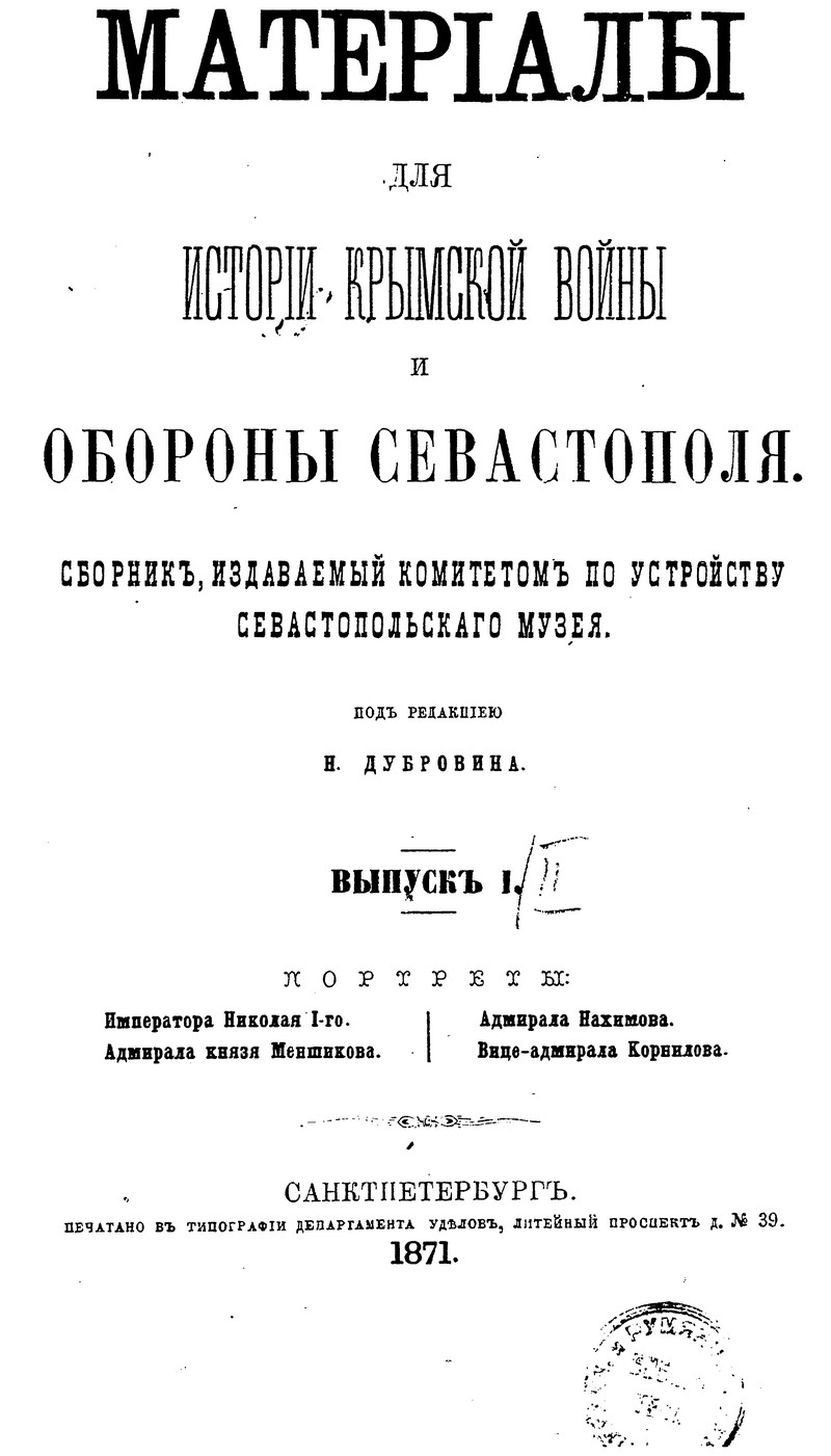 Объёмное собрание материалов по истории Крымской (Восточной) войны 1853-1856 гг. было подготовлено к изданию известным российским военным историком и публицистом, академиком Петербургской академии наук, членом военно-учёного комитета, генералом Николаем Федоровичем Дубровиным. В 1869 г. он был прикомандирован к Главному штабу для военно-исторических работ и приступил к сбору самых разнообразных документальных свидетельств о подготовке и проведении военных операций этой войны. В состав коллекции документов и материалов входит официальная переписка дипломатического и военного характера, многочисленные публикации периодических изданий не только российской, но и зарубежной прессы, воспоминания и свидетельства участников героической обороны Севастополя, а также специально собранные сведения о выдающихся военачальниках Крымской войны: адмиралах П.С. Нахимове, В.И. Истомине, Ф.М. Новосильском, генералах Э.И. Тотлебене, С.А. Хрулёве, М.Д. Горчакове, и Д.Е. Остен-Сакене, а также ряде других. В дальнейшем собранный воедино этот уникальный материал был использован Дубровиным для подготовки фундаментального труда