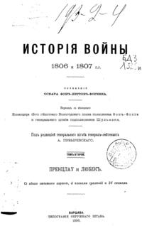 Перевод на русский язык фундаментального многотомного военно-исторического труда по истории войны русско-прусского союза с Наполеоном в 1806-1807 годах, написанного немецким военным историком Оскаром фон Леттов-Форбеком, был подготовлен при штабе Варшавского военного округа под руководством генерал-лейтенанта Генерального штаба, профессора военной истории академии Генерального штаба А.К. Пузыревского, получив при этом одобрение Военного министерства. Деятельность А.К. Пузыревского как одного из выдающихся военных педагогов и просветителей получила в России широкую известность. Представленное им исследование немецкого военного писателя, снабженное многочисленными картами и схемами боевых действий, сих пор представляет научный интерес. Одним из важнейших достоинств данного исследования является то, что автор широко использовал богатейший документальный массив как прусских, так и французских военных архивов, создав объективную картину одного из сложнейших этапов эпохи наполеоновских войн. Русско-прусско-французская война 1806-1807 гг. война между 4-й коалицией европейских держав (Великобритания, Россия, Пруссия, Саксония, Швеция) и наполеоновской Францией. Фактически эти две кампании являлась продолжением русско-австро-французской войны 1805 г. Не имея общего плана войны, союзники действовали несогласованно, что позволило Наполеону разбить их поочерёдно. Так 2 (14) октября 1806 г. в масштабном сражении под Йеной и Ауэрштадтом французская армия разгромила прусско-саксонские войска, после чего наполеоновские войска оккупировали большую часть Пруссии и 12 (24) октября заняли Берлин. Русская армия в составе трёх корпусов (около 160 тыс. чел.) под командованием генерал-фельдмаршала М. Ф. Каменского сосредоточилась в районе Пултуск, Остроленка, Брест-Литовск, выдвинув передовые отряды к Висле. 16 (28) ноября французские войска заняли Варшаву. Наполеон предпринял попытку окружить главные силы русских войск, но 14 (26) декабря в сражении под Пултуском русские войска сорвали этот план, нанеся поражение корпусу маршала Ж. Ланна. Затем русская армия отошла в район Тыкоцина, а наполеоновские войска расположились на зимние квартиры. 4 (16) января 1807 русская армия под командованием нового командующего генерал-адъютанта Л.Л. Беннигсена начала наступление из района Бялы в Восточную Пруссию с целью не допустить занятия французами Кенигсберга и Пиллау и нанести поражение изолированным корпусам Нея и Бернадота. Наполеон, узнав о продвижении русских войск, 20 января (1 февраля) направил главные силы на север, пытаясь обойти левый фланг русской армии и отрезать экспедиционные силы русских от России. Русские войска, ведя арьергардные бои, отошли к Прейсиш-Эйлау, где 26–27 января (7– 8 февраля) произошло встречное упорное сражение, в котором русские войска успешно отразили удары наполеоновской армии. 2 (14) июня 1807 г. в сражении под Фридландом русская армия, проявив чудеса героизма и мужества, вследствие неадекватных мер командования, была вынуждена отступить. В июне 1807 г. состоялось свидание Наполеона с императором Александром I в Тильзите и был подписан тяжёлый для России вынужденный союзный договор с наполеоновской Францией. Все эти военно-исторические события детально изложены в данном труде.