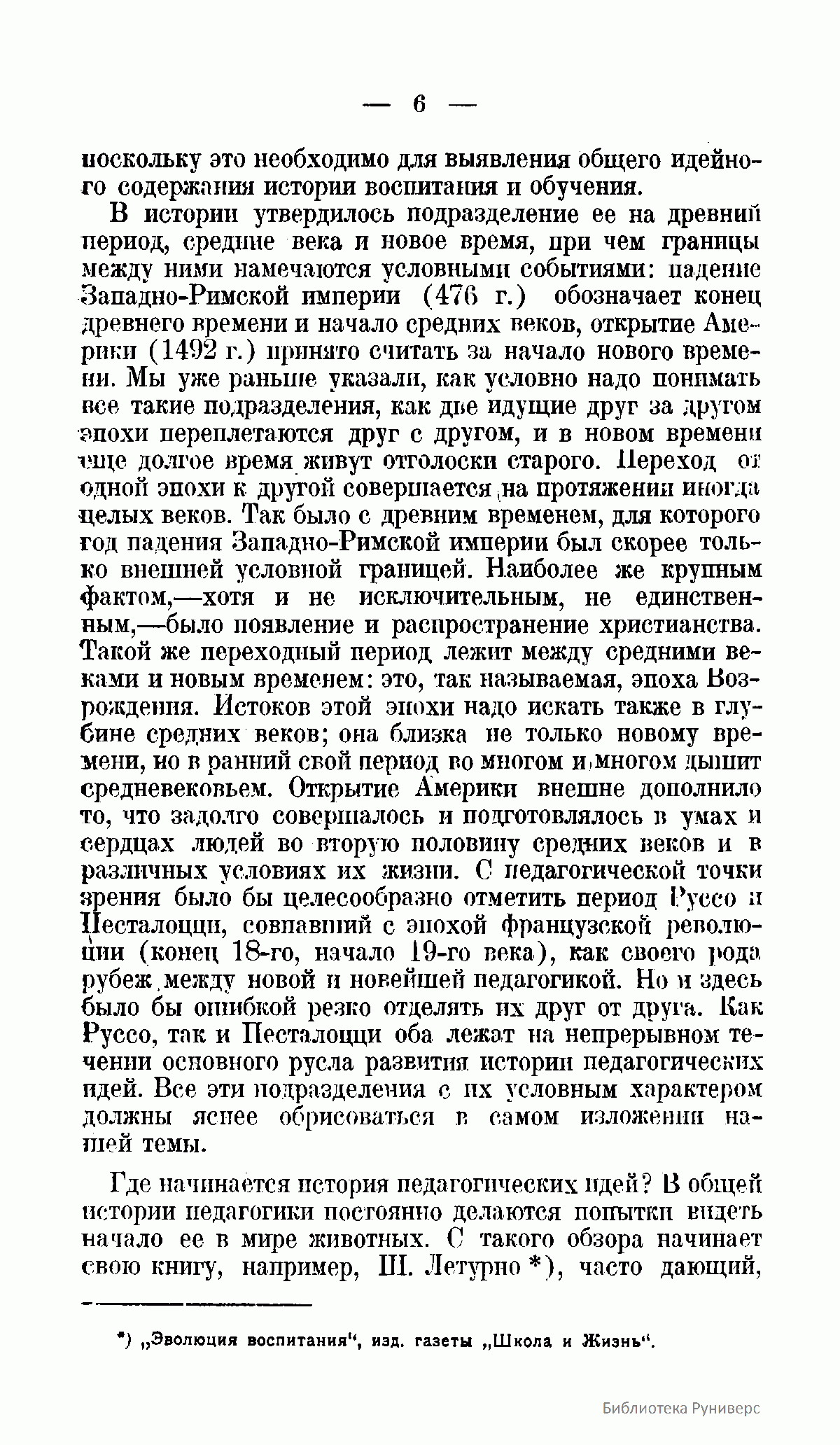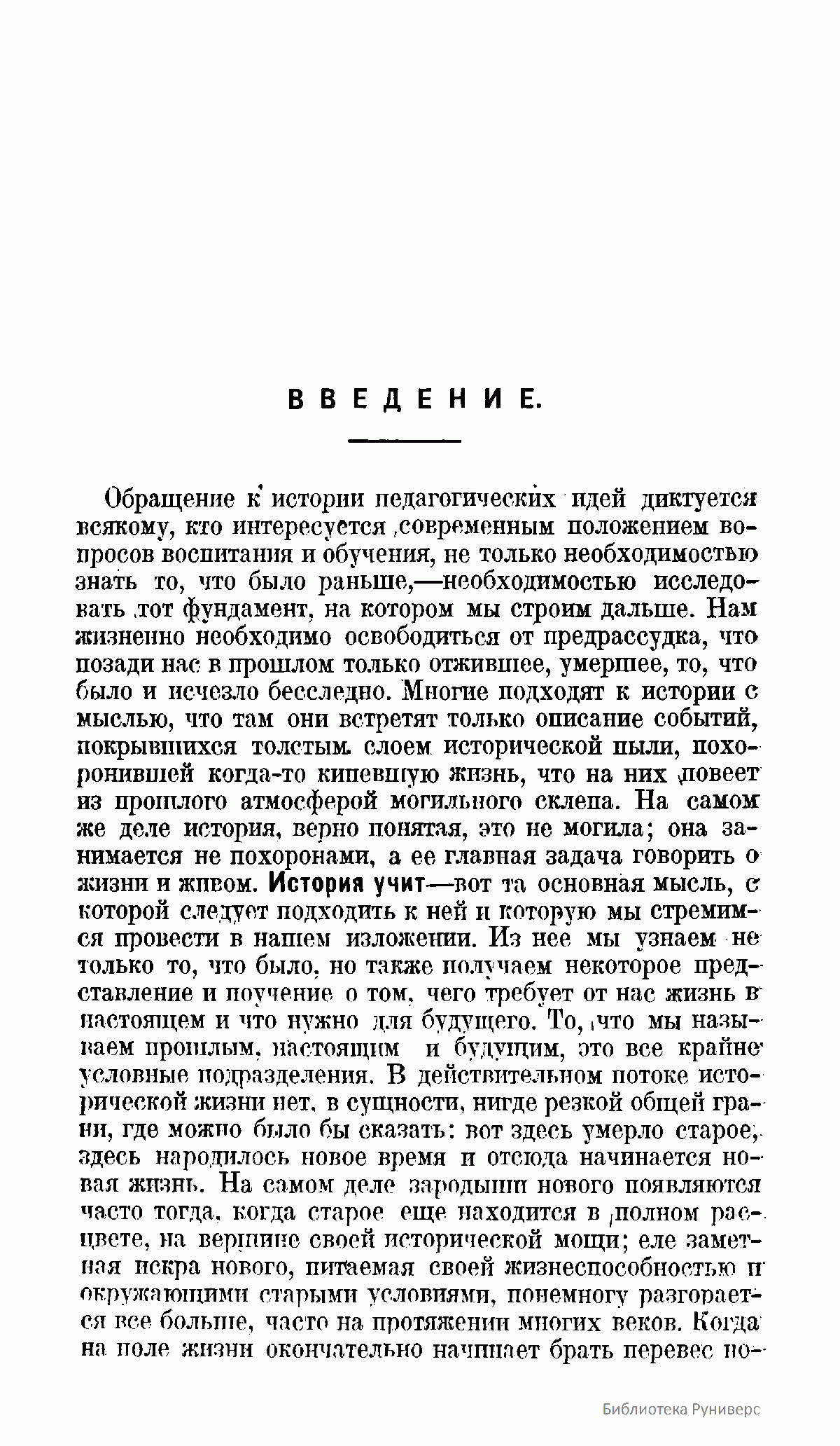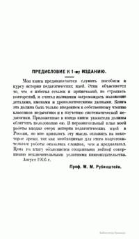 Книга "философа образования" М.М.Рубинштейна предназначена служить пособием к курсу истории педагогических идей, являясь своеобразным введением к непосредственному чтению классиков педагогики и систематической педагогики. В основу композиции этого учебного пособия положена "история идей", задача которой учить современников исходя из уже имеющегося в прошлом богатству философско-педагогических идей.