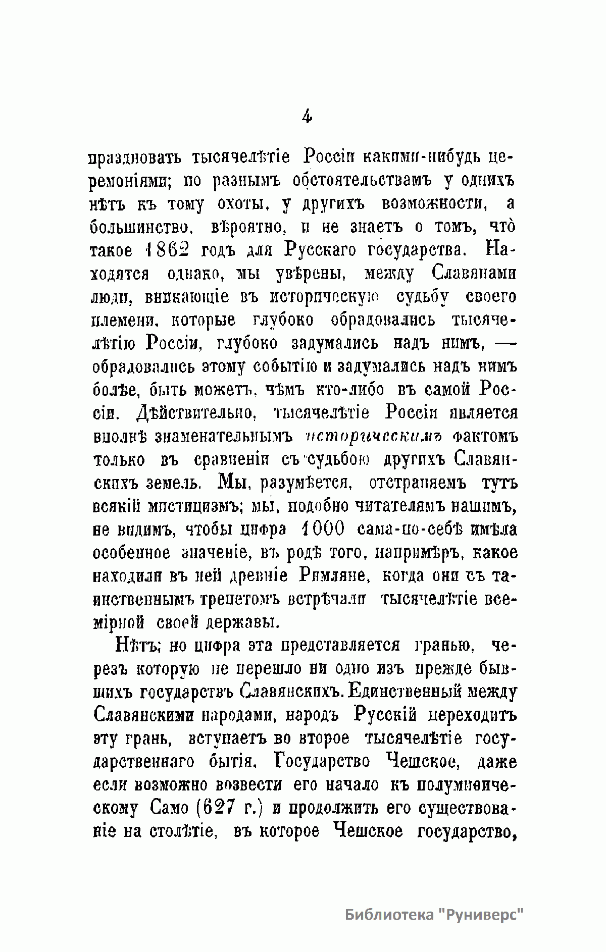 Популярная занимательная брошюра, посвященная предстоявшему в 1862 г. торжественному празднованию 1000-летия российской государственности (Тысячелетию России) принадлежит перу выдающегося отечественного славяноведа, прекрасного знатока истории, культуры, языка и верований славянских народов Александру Федоровичу Гильфердингу, автору значительных исследований в области общеславянской филологии. Автор, отмечая уникальность российской государственности, в весьма простой и доступной форме на примерах других славянских народов (государственных образований – мораван, чехов, поляков, словаков, хорватов, болгар и сербов), проводит сравнительный анализ причин распада славянских государств. Автор подробно останавливается на описании истории Чехии, оказавшейся, как и Польское государство, в орбите католической церкви и западноевропейской цивилизации в целом. Это «губительное», по мнению Гильфердинга, цивилизационное влияние настойчиво подавляло «стихию славянского начала», когда «Чешское государство стояло на высоте своего политического могущества». Именно этого удалось избежать российской национальной культуре, не подвергавшейся столь сильному влиянию западноевропейской (римско-католической, а затем протестантской) традиции, что и позволило восточнославянскому этносу сохранить свою самобытную государственность, достигнув тысячелетнего существования. Популярное исследование Гильфердинга весьма актуально в нынешних условиях преобразования современной России, отмечающей 1150-летие создания своей государственности.