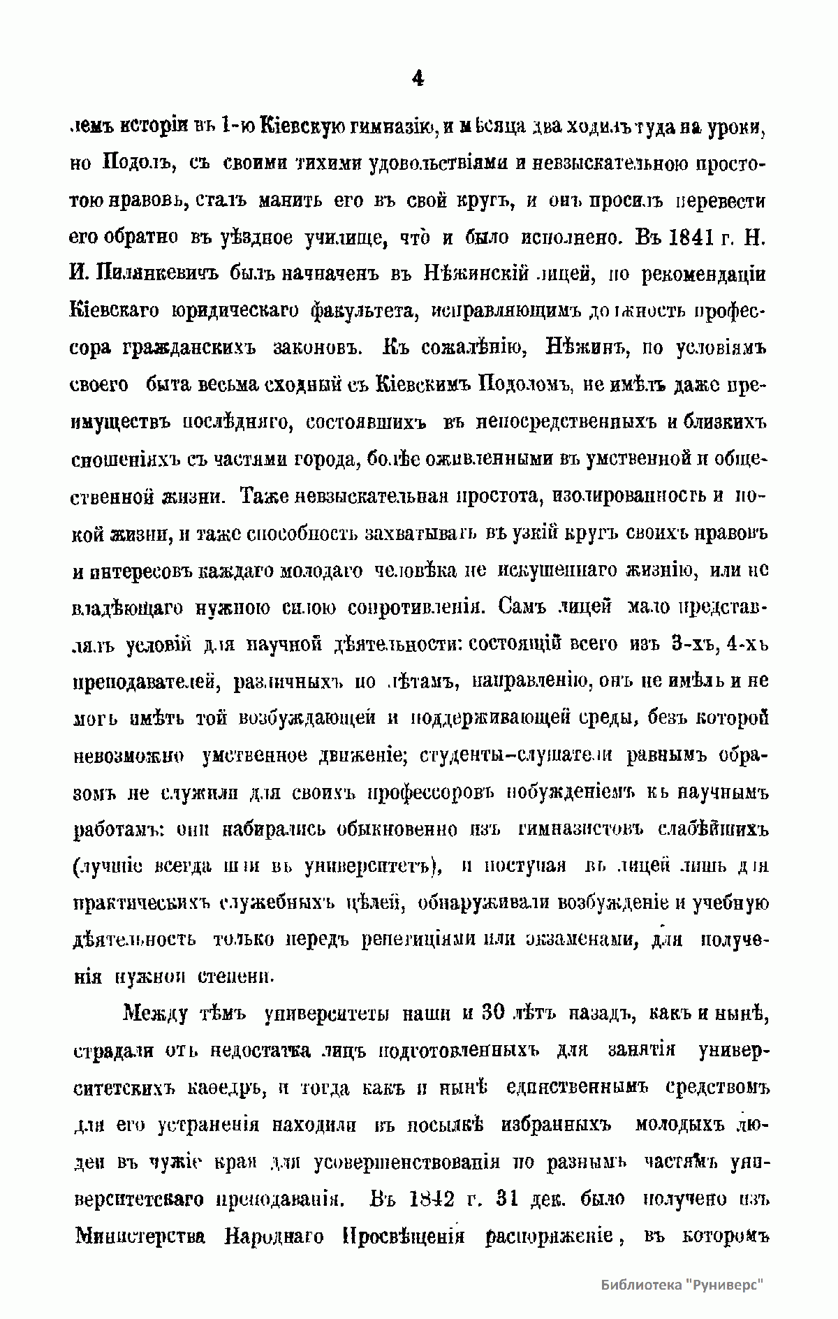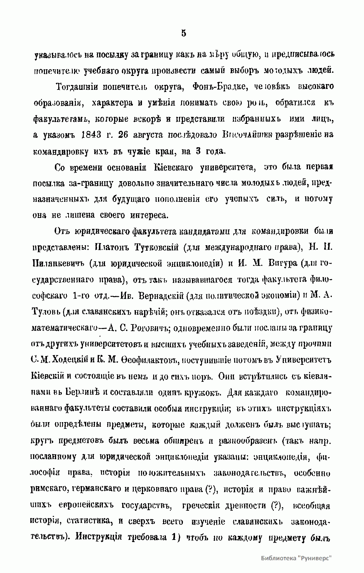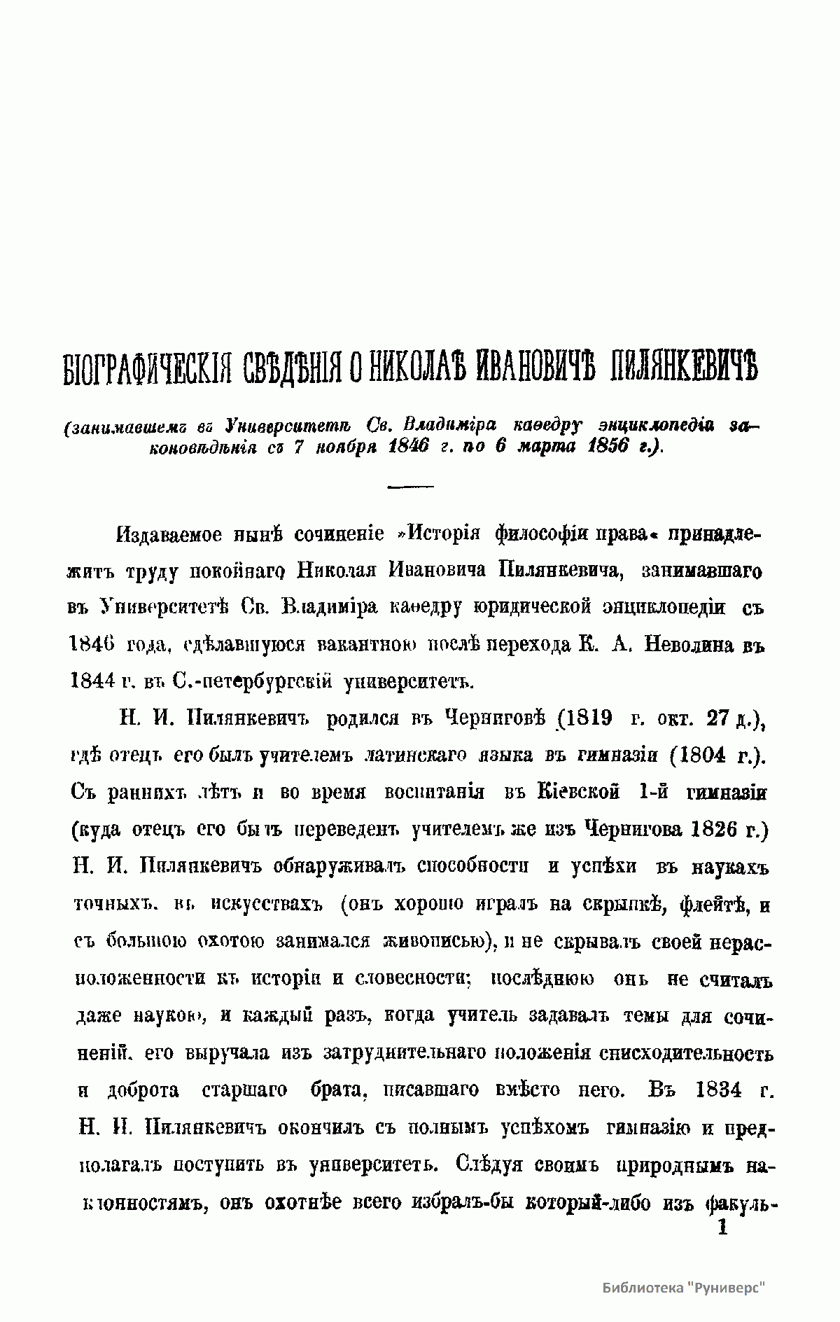 Издавая ныне труд Н.И. Пилянкевича, мы руководствовались многими соображениями: во-первых, мы думаем, что не смотря на значительное число лет, отделяющих его от настоящего времени, он может служить и теперь некоторым пособием и руководством для студентов-юристов, изучающих историю философии права, тем более что мы совершенно бедны сочинениями по этому предмету на русском языке; со времени истории философии права, представленной Неволиным в его Энциклопедии (1839 г.), приобретена нами всего одна книга: Очерк (весьма краткий) истории философии права Гейера (перевод с немецкого 1866 г.). Во- вторых, труд этот, совершенный в тяжелый период нашего высшего просвещения, может служить доказательством, что и тогда в наших университетах, при всем преобладании лишь формального исполнения своего долга, были лица, делавшие, по мере сил своих, настоящее дело. Наконец, изданием этого труда нам хотелось бы принести хотя позднюю поправку когда-то допущенной погрешности, и сколько-нибудь воздать добрую память Н.И. Пилянкевичу, который, без сомнения, заслуживал лучшей участи. Киев, 7 января 1870 г. Н. Ренненкампф