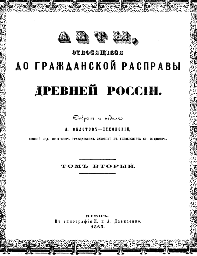 Собрание редчайших документов, составленное в 1860-1863 гг. А. Федотовым-Чеховским, ординарным профессором по кафедре гражданского права в университете св. Владимира в Киеве. Содержит акты, регулирующих главным образом древнерусское судопроизводство, а также сведения о феодальном землевладении, организации государственного управления, списки представителей государственной администрации. Включает правые, жалованные, разъезжие, деловые и др. грамоты.