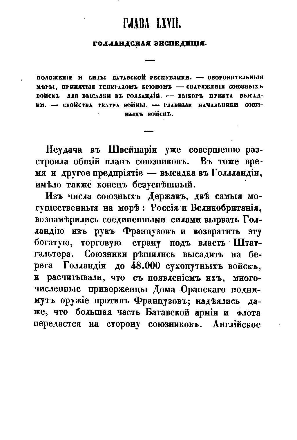 Масштабное сочинение, подготовленное по распоряжению императора Николая I, подробно описывает все обстоятельства военных и дипломатических действий, произошедших в период борьбы с революционной Францией. Повествование начинается с воцарения императора Павла, чьё влияние на последующие события, по мысли авторов, выводится решающим. Как можно более тщательно расписываются кулуарные обстоятельства переговоров и договоренностей между союзниками, совместные интриги и преследование личной выгоды всеми сторонами. Это — прямое следствие поставленной авторами цели: объяснить, почему после кровопролитных сражений в Европе в антифранцузской коалиции произошел раскол, приведший русского императора к неожиданному союзу с Наполеоном.