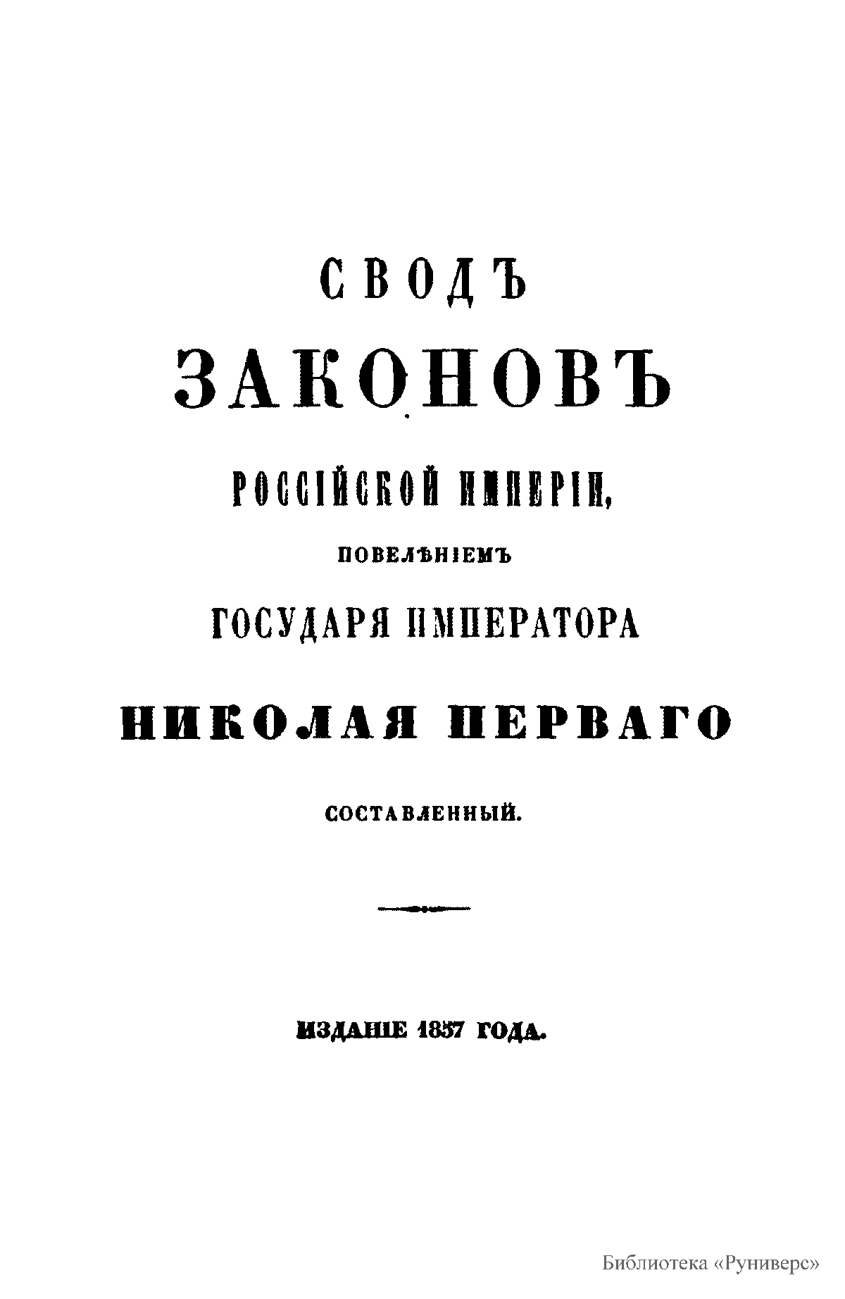 Свод законов Российской империи— официальное собрание расположенных в тематическом порядке действующих законодательных актов Российской империи, созданное при Николае I. Впервые он был напечатан в 1832 году. Манифестом 31 января 1833 года Свод законов был объявлен действующим источником права с 1 января 1835 года. Первое издание 1832 года и последующие 1842-го и 1857 года состояли из пятнадцати томов. После 1857 года Свод законов полностью не переиздавался, а выходили лишь отдельные тома. В качестве отдельного – 16-го тома в 1885 году вышли Судебные уставы. Между изданиями Свода законов выходили ежегодные и сводные (за несколько лет) «Продолжения» Свода законов с указанием на упраздненные и измененные статьи. В своде законов собраны все реально действовавшие в определенный момент времени законы по тем или иным проблемам права, это справочник для юристов. Отбор законодательного материала для включения в Свод производился на основе Полного собрания законов (первое Полное собрание законов, появившееся в 1830 году, состояло из 45 томов, содержащих 30 920 актов и 6 томов приложений). Собрание законов – это в большой степени историческое издание. По нему можно изучать развитие, направление правительственной мысли в стране. Это летопись отечественного законотворчества. Изучая страницу за страницей эту летопись, мы можем узнать, что в тот или иной момент истории являлось злобой дня.
