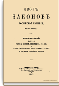Свод законов Российской империи— официальное собрание расположенных в тематическом порядке действующих законодательных актов Российской империи, созданное при Николае I. Впервые он был напечатан в 1832 году. Манифестом 31 января 1833 года Свод законов был объявлен действующим источником права с 1 января 1835 года. Первое издание 1832 года и последующие 1842-го и 1857 года состояли из пятнадцати томов. После 1857 года Свод законов полностью не переиздавался, а выходили лишь отдельные тома. В качестве отдельного – 16-го тома в 1885 году вышли Судебные уставы. Между изданиями Свода законов выходили ежегодные и сводные (за несколько лет) «Продолжения» Свода законов с указанием на упраздненные и измененные статьи. В своде законов собраны все реально действовавшие в определенный момент времени законы по тем или иным проблемам права, это справочник для юристов. Отбор законодательного материала для включения в Свод производился на основе Полного собрания законов (первое Полное собрание законов, появившееся в 1830 году, состояло из 45 томов, содержащих 30 920 актов и 6 томов приложений). Собрание законов – это в большой степени историческое издание. По нему можно изучать развитие, направление правительственной мысли в стране. Это летопись отечественного законотворчества. Изучая страницу за страницей эту летопись, мы можем узнать, что в тот или иной момент истории являлось злобой дня.