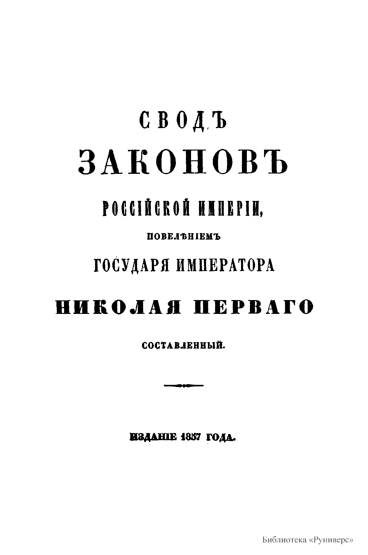 Свод законов Российской империи— официальное собрание расположенных в тематическом порядке действующих законодательных актов Российской империи, созданное при Николае I. Впервые он был напечатан в 1832 году. Манифестом 31 января 1833 года Свод законов был объявлен действующим источником права с 1 января 1835 года. Первое издание 1832 года и последующие 1842-го и 1857 года состояли из пятнадцати томов. После 1857 года Свод законов полностью не переиздавался, а выходили лишь отдельные тома. В качестве отдельного – 16-го тома в 1885 году вышли Судебные уставы. Между изданиями Свода законов выходили ежегодные и сводные (за несколько лет) «Продолжения» Свода законов с указанием на упраздненные и измененные статьи. В своде законов собраны все реально действовавшие в определенный момент времени законы по тем или иным проблемам права, это справочник для юристов. Отбор законодательного материала для включения в Свод производился на основе Полного собрания законов (первое Полное собрание законов, появившееся в 1830 году, состояло из 45 томов, содержащих 30 920 актов и 6 томов приложений). Собрание законов – это в большой степени историческое издание. По нему можно изучать развитие, направление правительственной мысли в стране. Это летопись отечественного законотворчества. Изучая страницу за страницей эту летопись, мы можем узнать, что в тот или иной момент истории являлось злобой дня.