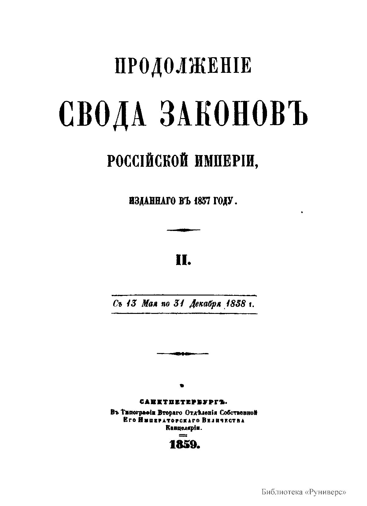 Продолжение свода законов Российской империи, изданного в 1857 году. Продолжение №II. С 13 мая по 31 декабря 1858 года