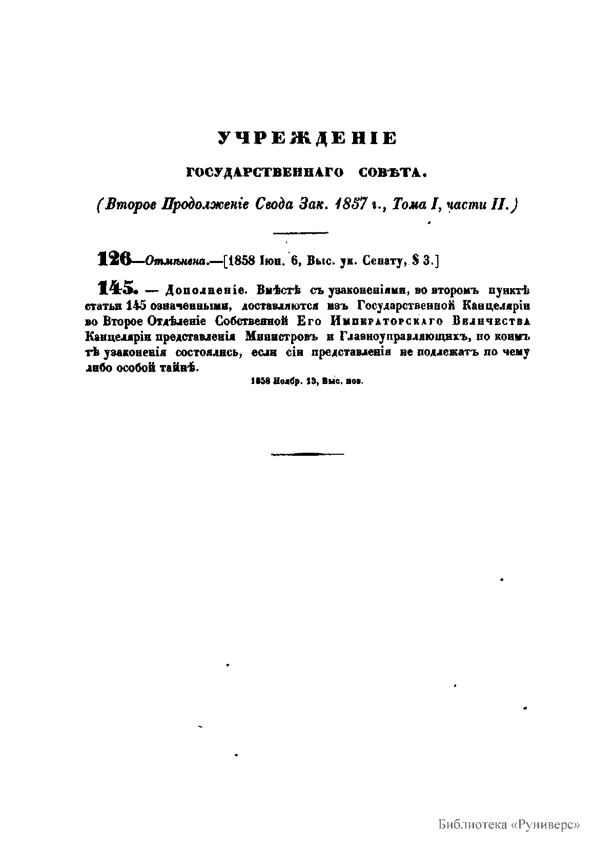Продолженiе свода законовъ Россiйской имперiи, изданнаго въ 1857 году. Продолженiе №II. Съ 13 мая по 31 декабря 1858 года