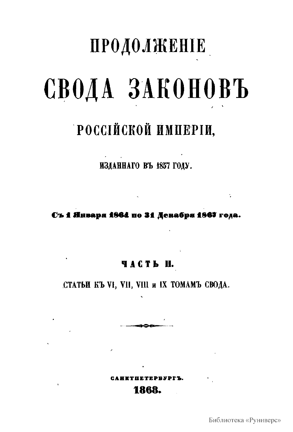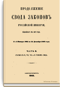 Продолжение свода законов Российской империи, изданного в 1857 году. С 1 января 1864 по 31 декабря 1867 года. Часть II. Статьи к VI, VII, VIII и IX томам свода